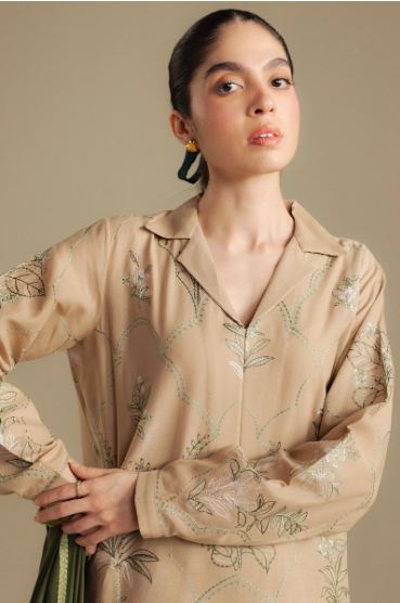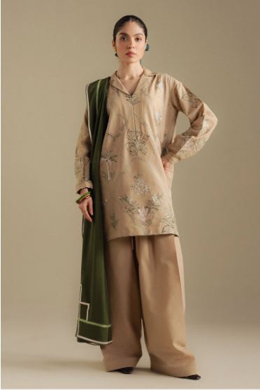 A deep mocha khaddar shirt and trouser paired with an olive green shawl, a grounded mix of warmth and ease for winter days.
