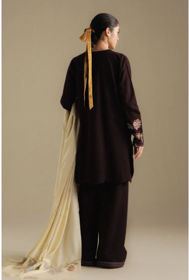 A warm brown khaddar shirt and trouser paired with an off-white shawl, a timeless contrast that carries quiet winter elegance.