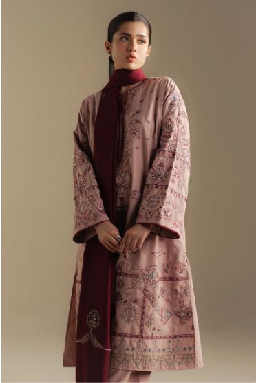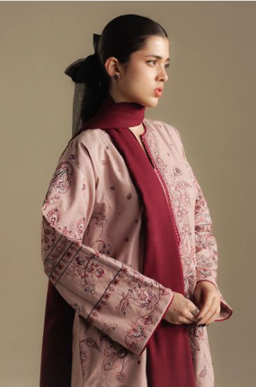 A soft salmon pink karandi shirt and trouser paired with a rosewood shawl, a graceful blend of warmth and femininity for the winter season.