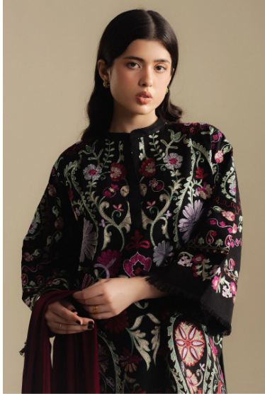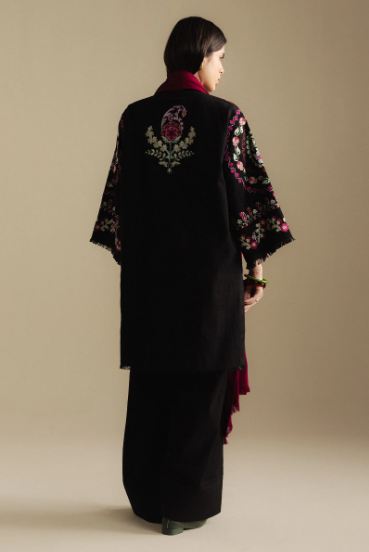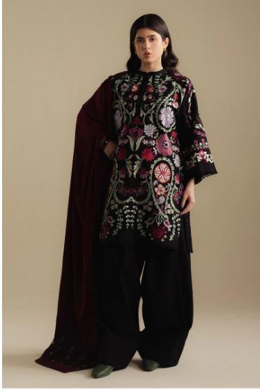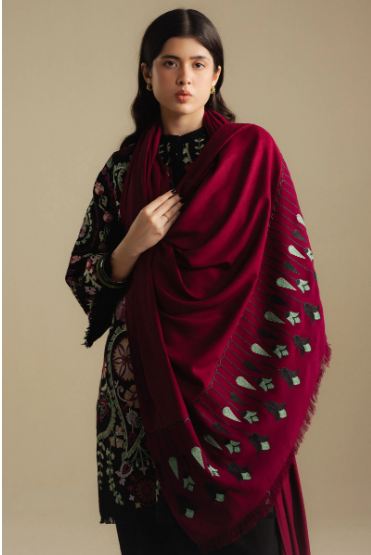 A classic black khaddar shirt and trouser paired with a maroon shawl, a bold winter contrast that feels both refined and enduring.
