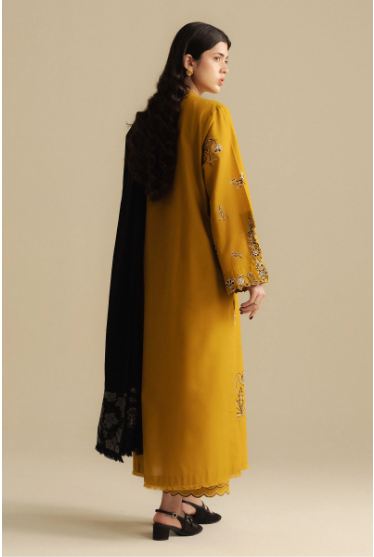 A mustard yellow khaddar shirt and trouser paired with a black and charcoal shawl, a striking winter contrast full of warmth and depth.