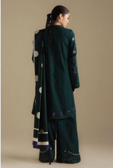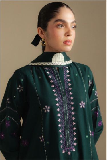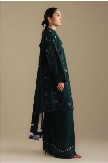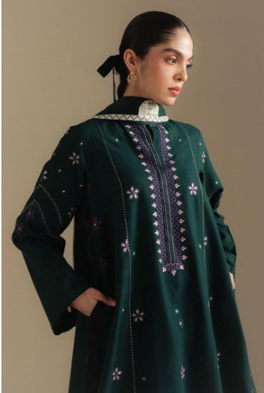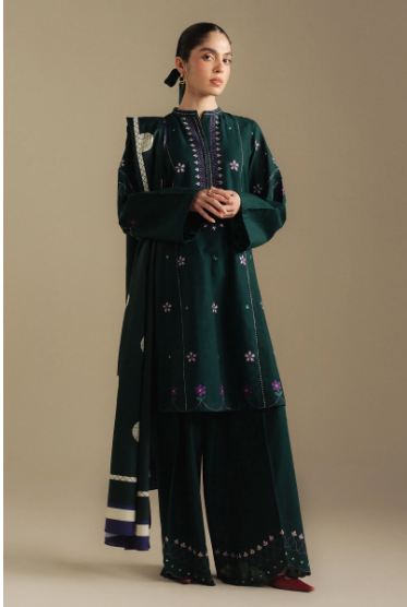 An emerald green khaddar shirt and trouser paired with a shawl in emerald green and purple, a regal blend of tones that carries depth and winter richness.