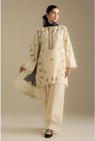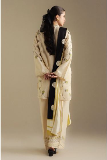 An off-white khaddar shirt and trouser paired with a black and olive shawl, a refined contrast that feels modern yet grounded for winter.