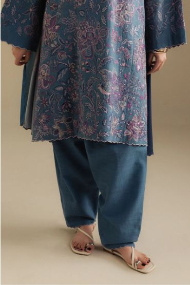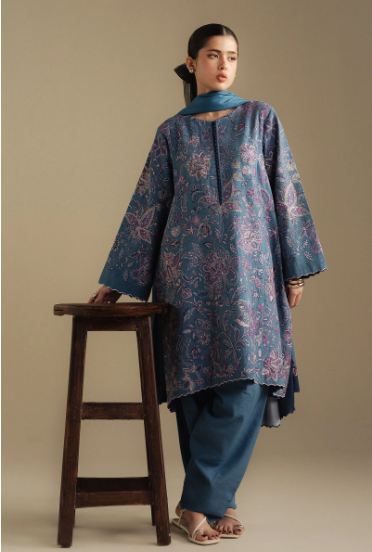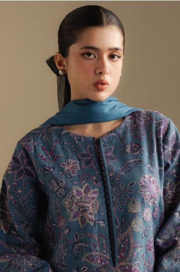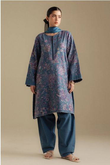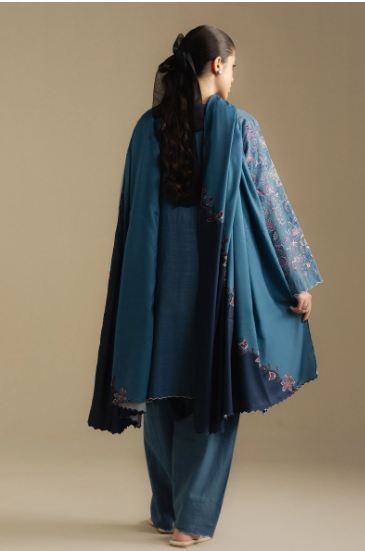A marine blue khaddar shirt and trouser styled with a cerulean and blue shawl, a cool-toned harmony made for crisp winter days.