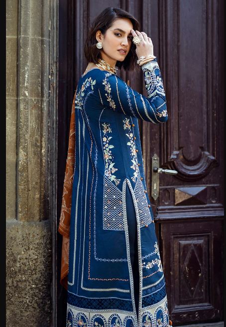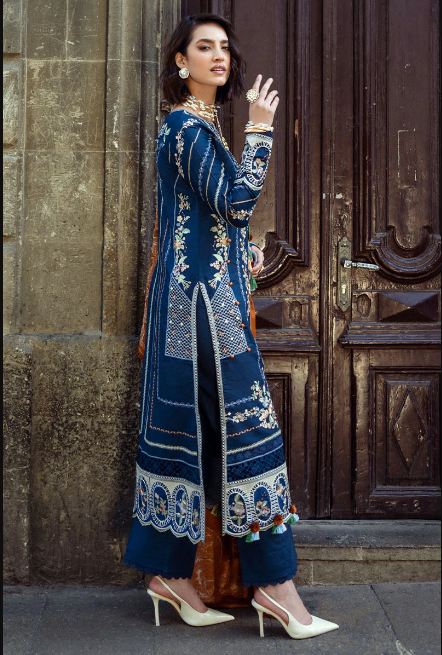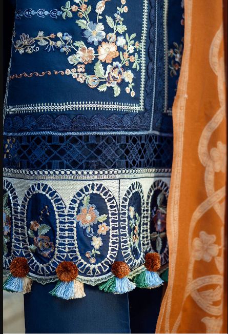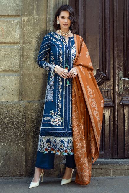 Sweet Surrender" in vibrant blue features an elegantly embroidered crepe shirt paired with a rich rust woolen shawl. Adorned with wool thread tassels, delicate crochet lace finishings, and stylish buttons, this ensemble perfectly blends sophistication and warmth.